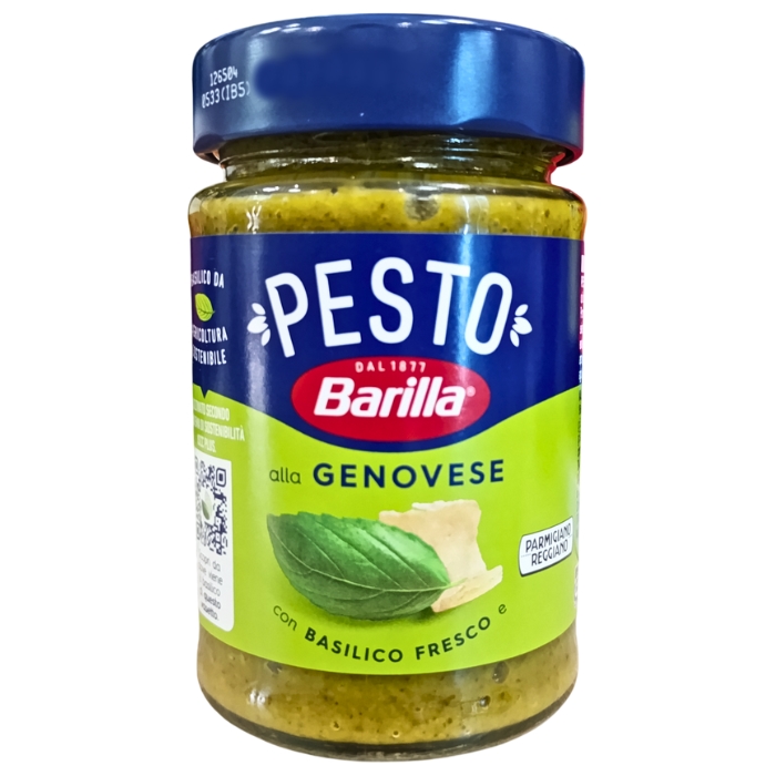 Barilla Pesto alla Genovese — традиционный соус из свежего базилика (30%), кешью, оливкового масла и оригинального сыра Parmigiano Reggiano DOP. Идеально подходит к пасте, мясным блюдам, овощам и брускеттам.